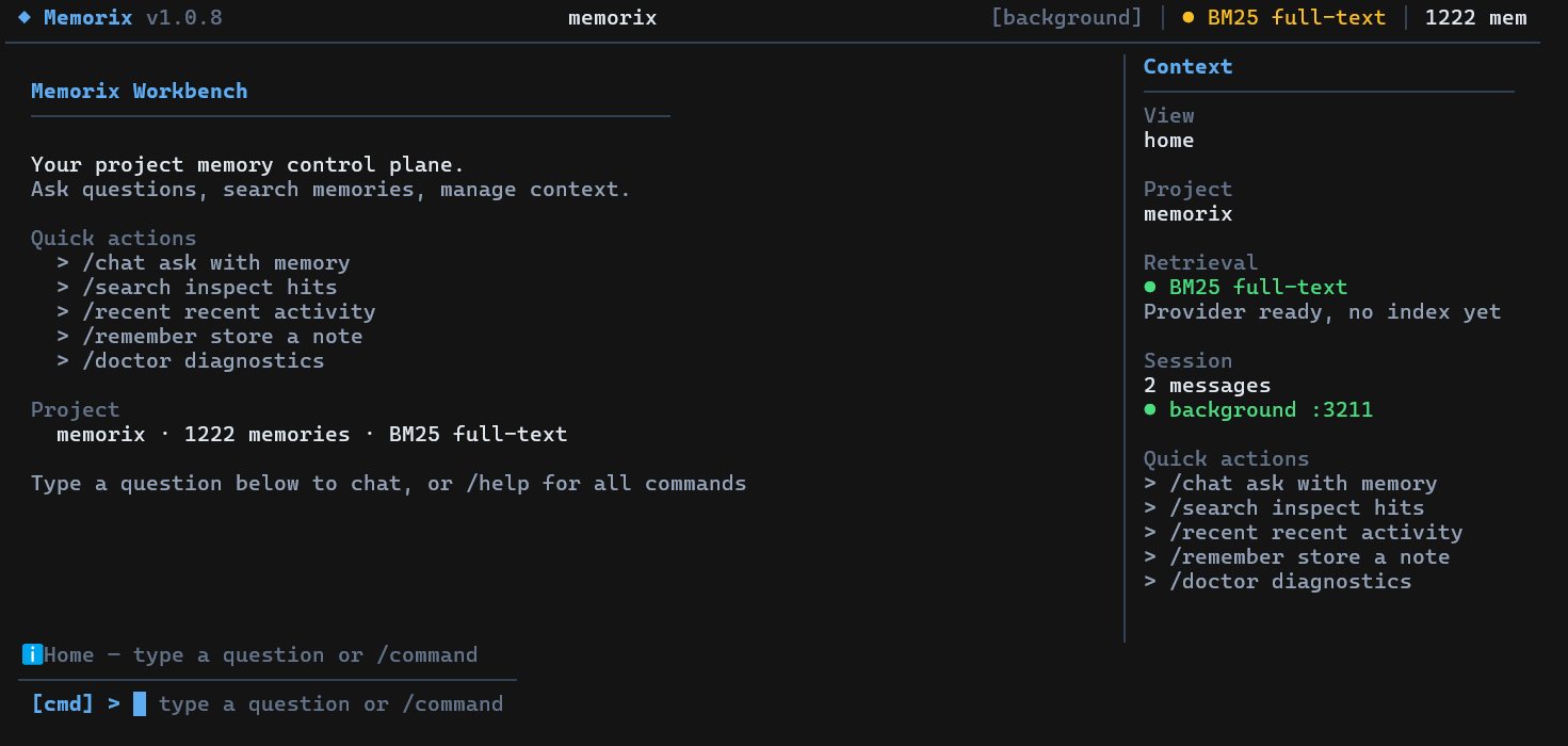 Running memorix without arguments opens an interactive fullscreen terminal UI (requires a TTY). Use it for chat with project memory, search, quick memory capture, diagnostics, background service control, dashboard launch, and IDE setup. Press /help inside the TUI for the current command list.