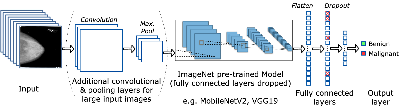 Convolution Neural Networks (CNNs) are used as part of a pipeline based on deep learning techniques. A divide and conquer approach is followed to analyse the effects on performance and efficiency when utilising diverse deep learning techniques such as varying network architectures (VGG19, ResNet50, InceptionV3, DenseNet121, MobileNetV2), class weights, input sizes, image ratios, pre-processing techniques, transfer learning, dropout rates, and types of mammogram projections.