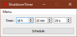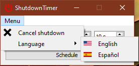 A very simple shutdown scheduler for Windows. Just enter the count down time and press "schedule", you can cancel the shutdown from the menu, you can also change the language (English and Spanish) there.