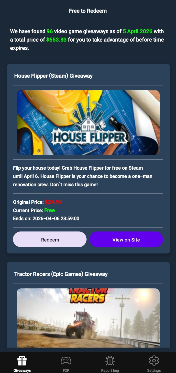 Frapp (freebie radar APP) is an app that enables you to get the latest video game giveaways as well as the latest free games. The app acts as a messenger as it dives into different sites such as Gog , itch.io, Epic games, Steam and so much more using the power of the gamepower API.