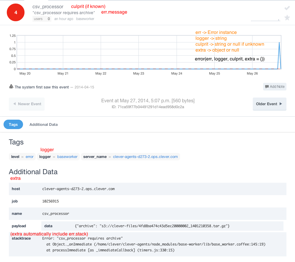 message: what was the exception? Always the message from the passed in error.logger: what piece of code generated the message to Sentry? Usually just whatever application actually holds the Sentry client.extra: what other information is needed to determine the cause of the error