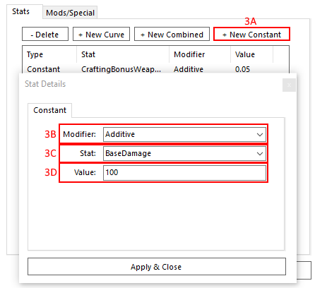 3.) To add a new stat, click on "New Constant". Set the Modifier to 'Additive', set the Stat to whichever stat you'd like to edit (for example: 'BaseDamage'), and set the Value to however much you'd like to add to that stat (for example: if a weapon has 57 base damage, adding a 'BaseDamage' stat of 100 will give it a total base damage of 157.) You can also use negative numbers to subtract from the stat.