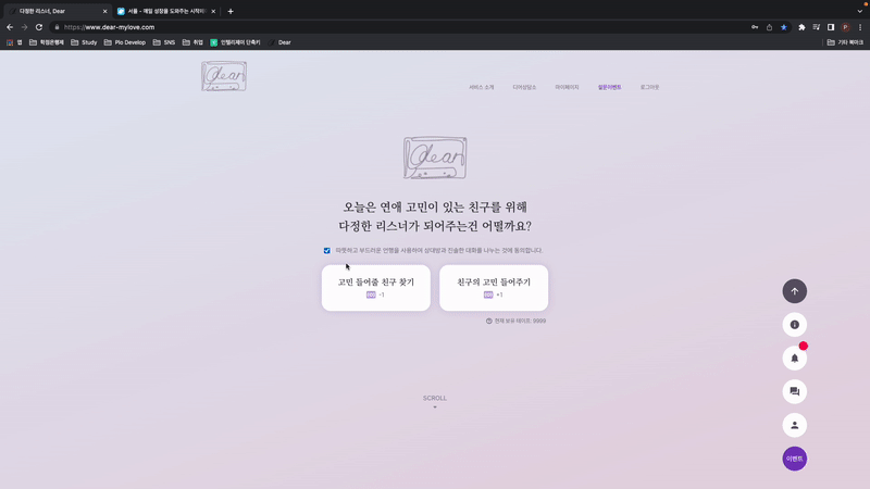 - 대화가 부담스러운 날에는 디어 상담소에서 사람들과 소통해요! 간단한 질문은 투표로 남겨보세요!