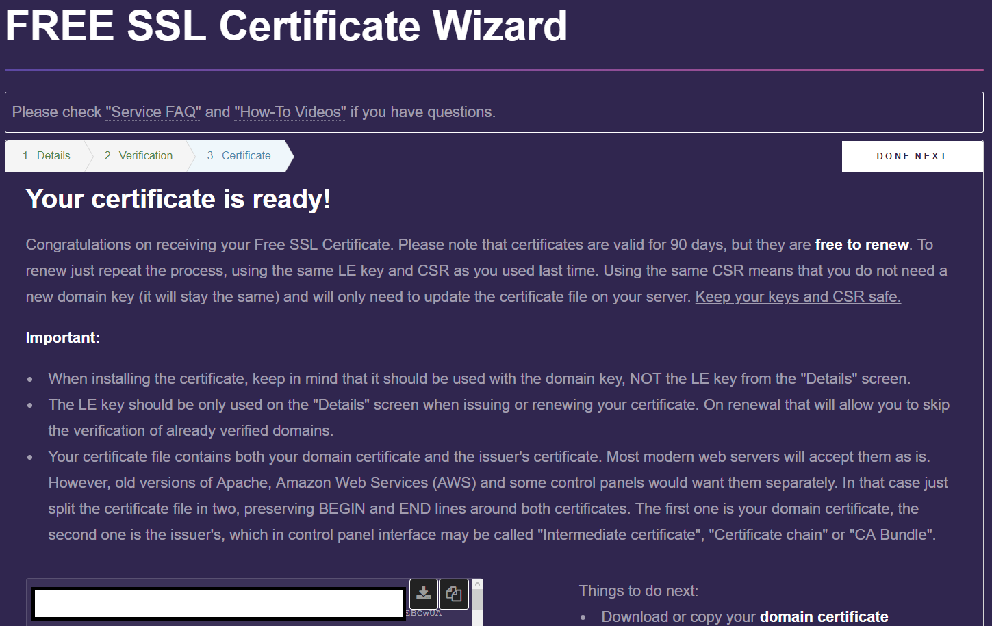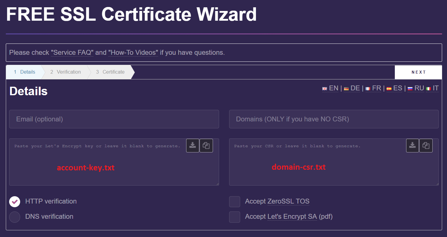 - Open the page for creating/updating the certificate https://zerossl.com/free-ssl/#crt