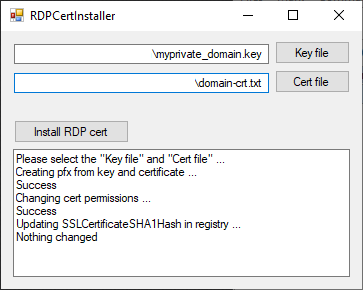 RDPCertInstaller.exe(administrator rights are required as the system registry is modified) - Specify the following files:
