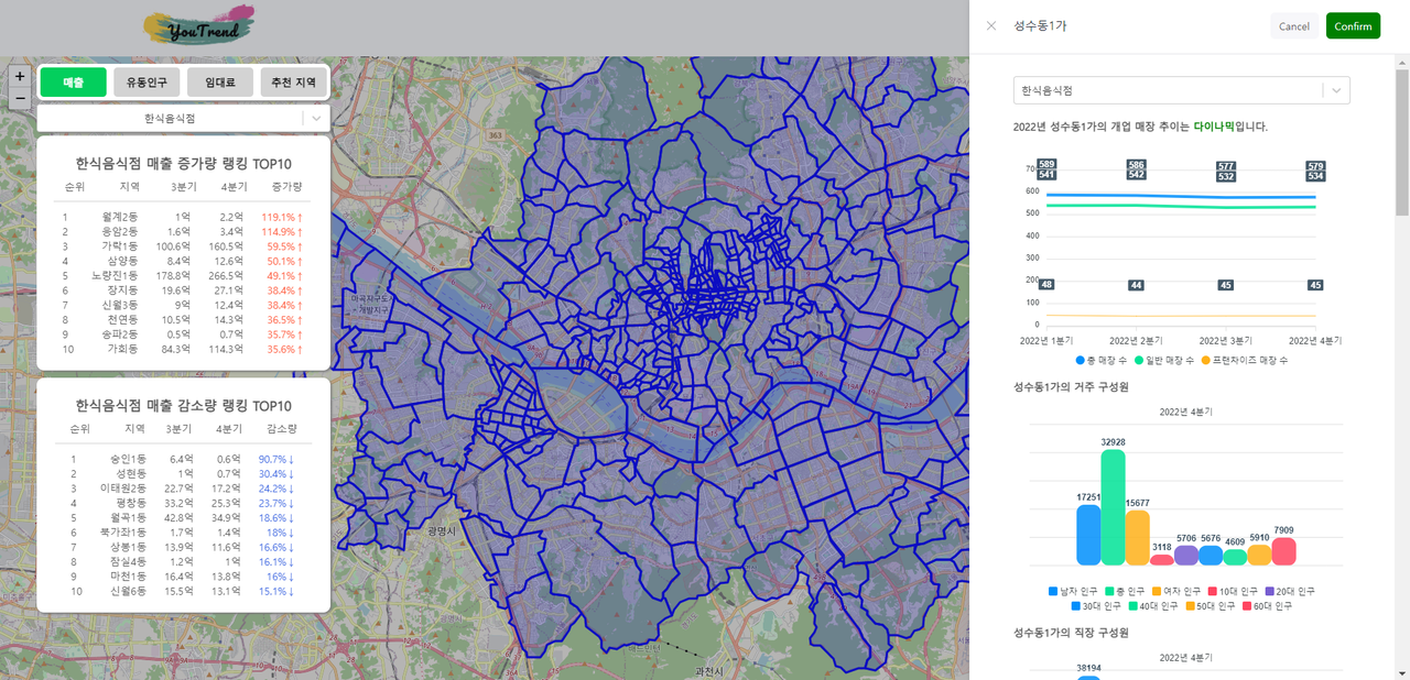 Userν μ΄λΈ: μ¬μ©μ μ 보λ₯Ό μ μ₯νλ ν μ΄λΈμ λλ€. μ¬μ©μμ κΈ°λ³Έ μ 보μ ν¨κ» μ νΈνλ μ°½μ μμ΄ν , μμ° λ±μ μ 보λ₯Ό κ΄λ¦¬ν©λλ€.Regionν μ΄λΈ: μμΈμμ κ° κ΅¬μ μ 보λ₯Ό μ μ₯νλ ν μ΄λΈμ λλ€. ꡬμλ³ μκΆ νν©κ³Ό νΈλ λ μ 보λ₯Ό ν¬ν¨ν©λλ€.Storeν μ΄λΈ: κ° κ΅¬μ λ΄ μ ν¬ μ 보λ₯Ό μ μ₯νλ ν μ΄λΈμ λλ€. μ ν¬μ μ μ’ , λ§€μΆ, κ°μ /νμ μ 보 λ±μ κ΄λ¦¬ν©λλ€.SalesDataν μ΄λΈ: κ° μ ν¬μ λ§€μΆ λ°μ΄ν°λ₯Ό μ μ₯νλ ν μ΄λΈμ λλ€. μκ³μ΄ λ°μ΄ν°λ‘ ꡬμ±λμ΄ μμΌλ©°, μκΆ λΆμμ νμ©λ©λλ€.Recommendationν μ΄λΈ: μ¬μ©μμκ² μΆμ²λ μ°½μ μ₯μ μ 보λ₯Ό μ μ₯νλ ν μ΄λΈμ λλ€. μ¬μ©μμ μ νΈλμ μκΆ λΆμ κ²°κ³Όλ₯Ό λ°νμΌλ‘ μμ±λ©λλ€.
