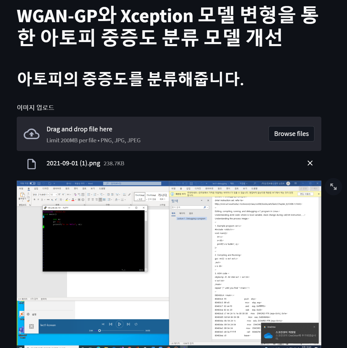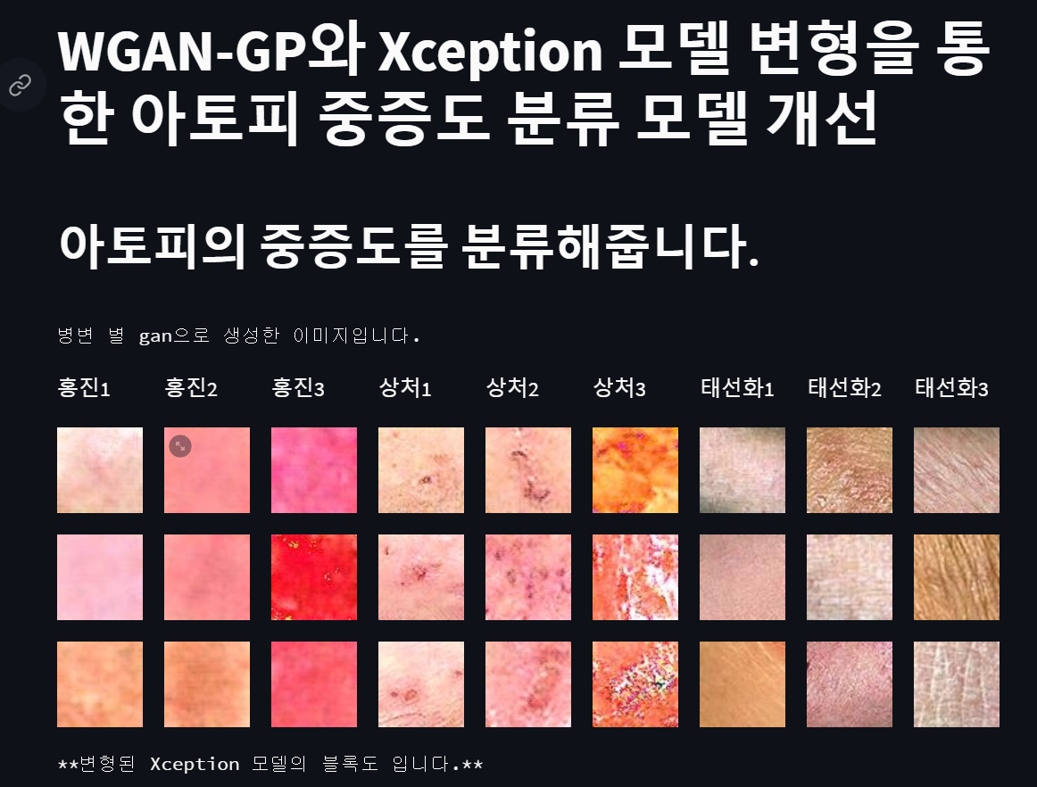streamlit을 이용한 간단한 모델 배포 파이썬 설치 후 패키지 설치 pip install streamlit pip install tensorflow pip install opencv-python pip install matplotlib 브라우저에 띄우기 streamlit run main.py 위의 명령어가 듣지 않을 시 python -m streamlit run main.py 현재 구현된 기능 파일 업로드 후 보여주기 이미지 전처리 gan으로ㅓ 생성한 이미지 보여주기 파일 업로드하면 아토피 중증도 분류해주기 배포된 주소 https://inhaatopyclassifier.streamlit.app/
