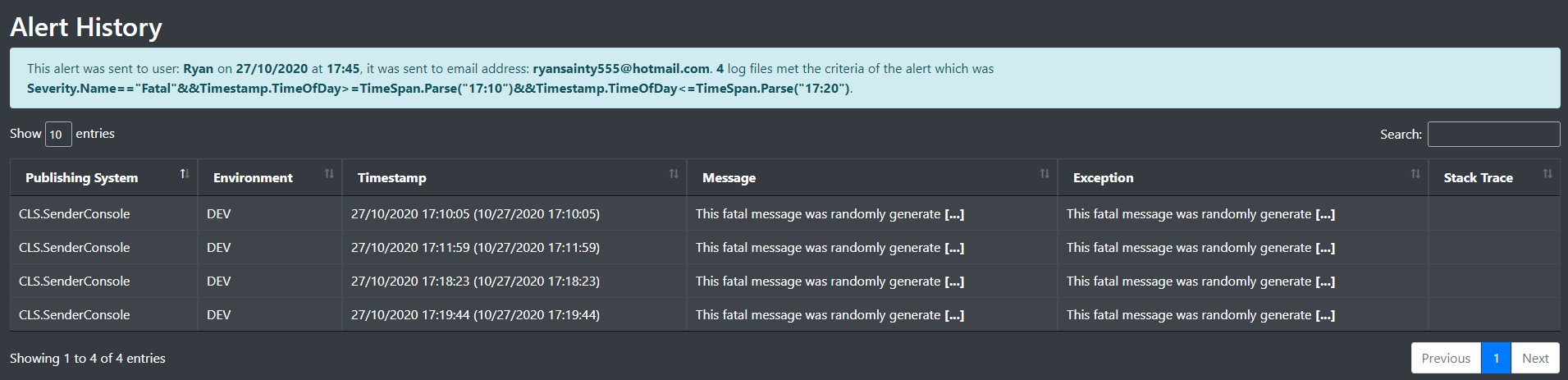 The CLS.SenderConsole will periodically send randomised log messages into the target database in order to aid in development. In production, the CLS.Sender is simply a library which will be inclduded in the systems you want to log from.