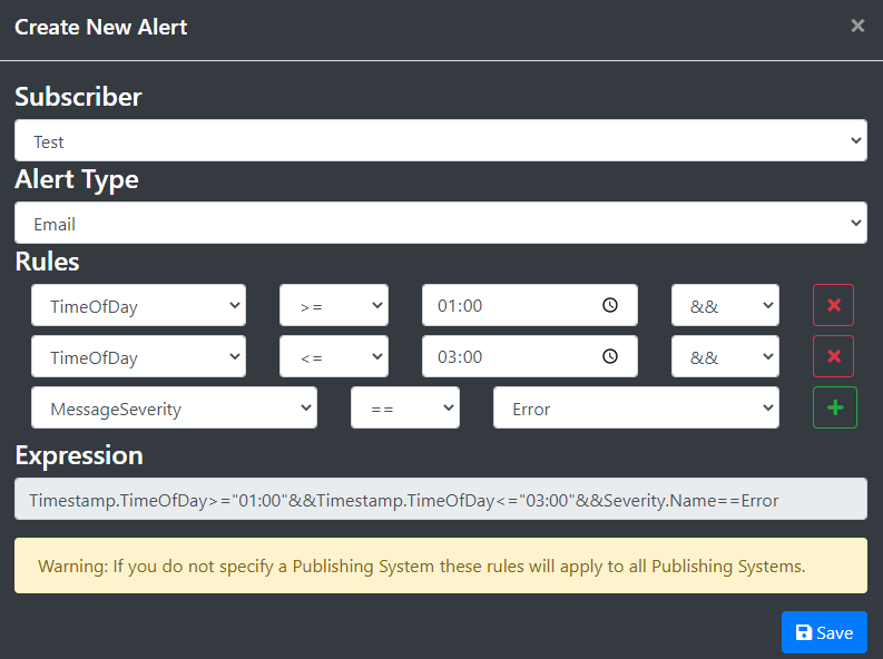Navigate to the alerts page then click + New Alert and you'll be presented with the following form to complete, I've filled out the one below with an example scenario whereby we want to be alerted when any Publishing System sends an error into the database between 1am and 3am: