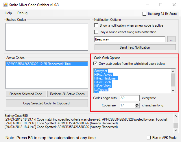 8) Once you have setup the program using the previous steps you can tick the AFK Mode box which will redeem codes as they come in automatically (MAKE SURE SMITE IS KEPT RUNNING AT ALL TIMES, IT CAN BE MINIMISED AND STILL FUNCTION!).