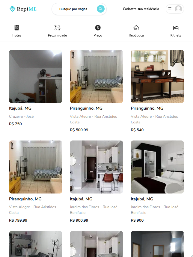 A aplicação web RepiMe busca centralizar, gerenciar e organizar as informações sobre as vagas em Repúblicas e Kitnets disponíveis na cidade e universidades suportadas.