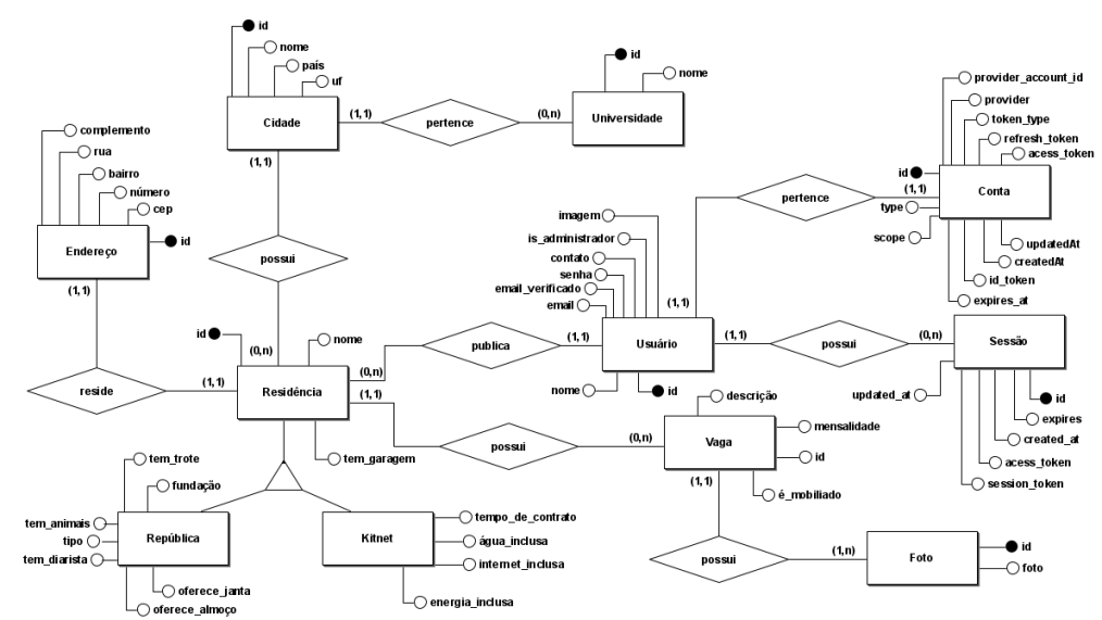 A aplicação utiliza um banco relacional presente no modelo entidade relacionamento abaixo. A modelagem visa permitir o registro dos cadastros de usuários, vagas, residências, locadores, vagas e cidades. A hospedagem foi feita no Heroku com o add-on Heroku Postgres e a aplicação conversa com o banco através de uma API. O pgAdmin4 facilitou o processo de criação e vizualização das tabelas/relacionamentos.