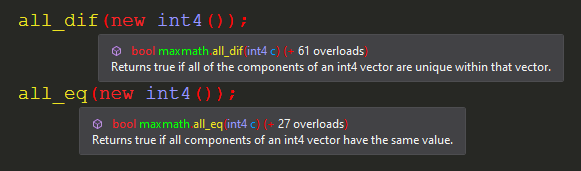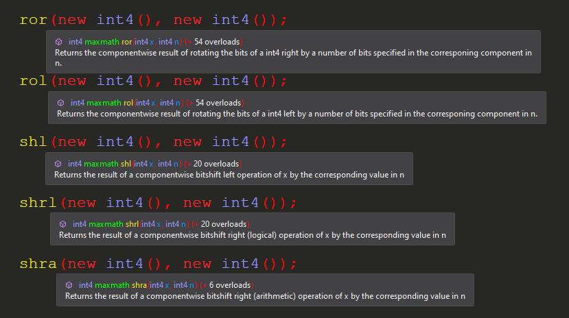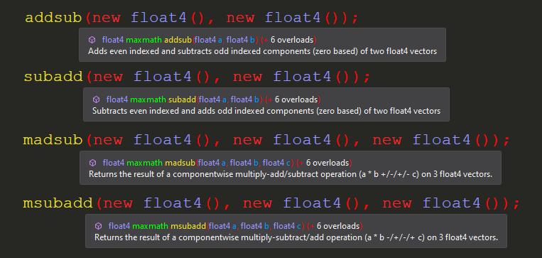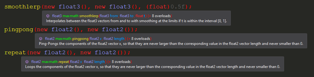 byte32,short16,int8, andfloat8. This allows you to leverage the full potential of SIMD computation. - Many Additional Functions: MaxMath includes a massive library of mathematical functions not found in Unity.Mathematics, with about five times as many highly optimized functions at your disposal. Each function is fully documented with XML annotations. A full list is provided further below.