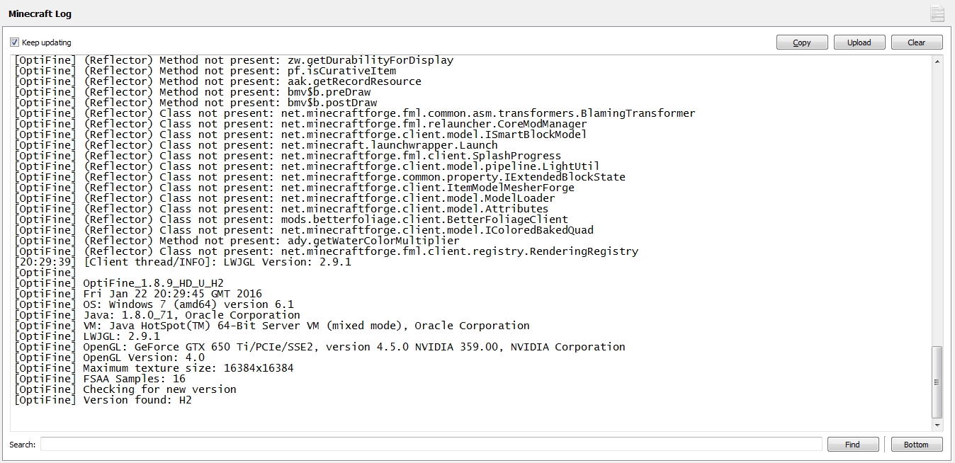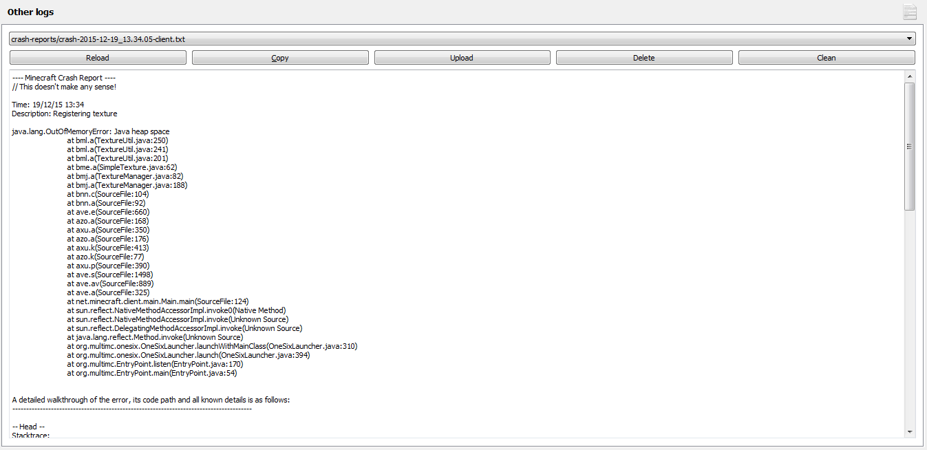 This page is only available when running an instance. It shows the main Minecraft output and updates in real time. It has functions for uploading the log to paste.ee, copying the log to the clipboard, and clearing the log input (useful if you have a long log).