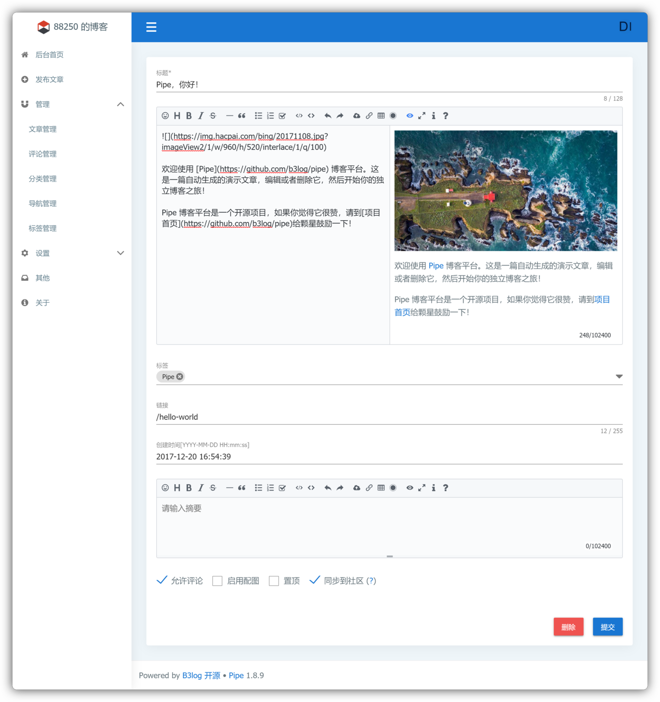 Pipe 的文章编辑器支持 Markdown,并支持复制/粘贴图片、粘贴 HTML 自动转换 Markdown、流程图、数学公式等。