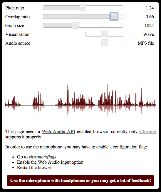 This is a very simple pitch shifter using HTML5 Web Audio API. It's based in the principles of granular synthesis, instead of FFT analysis and transformation, to keep things simple and fast. In order to use the microphone input, a browser supporting the Media Stream API is needed.