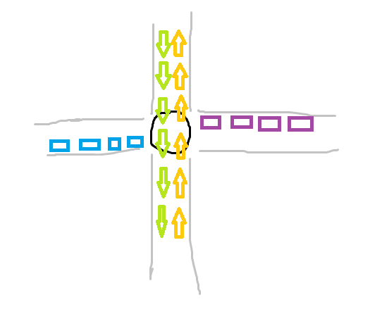 В эту часть пока не вникал, но давай сделаем, чтобы на перекрестке без светофора машины не могли сквозь перпендикулярный поток проезжать