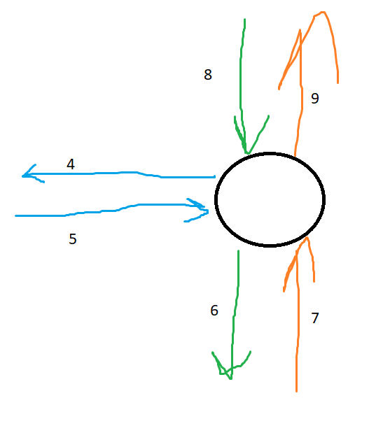 Я понял, что ты хочешь intersectaion для синих и зеленых, чтобы когда зеленые едут из 8 в 6, синие из 5 не могли проехать в 9 (в 6 они не проедут, потому что на этот случай создается intersaction). Вот что делать с 9 в этом случае, я не придумал, но если мы запускаем зеленых и оранжевых, то в 9 возникает конфликт синих и оранжевых, так что синие ехать не смогут. Intersaction создается если два курса ведут в одну дорогу, более того в одну полосу. Как определять их пересечения внутри самой node, повторю, я не придумал. Мне кажется это не критично. В любом случае мы добиваемся того, что два потока не могу одновременно ломиться в один выход из node.