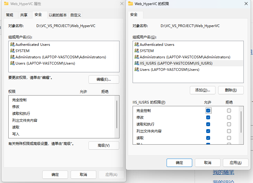 在 属性-安全-编辑-添加 中新增IIS用户组,一般命名为IIS_IUSRS,并勾选完全控制权限点击确定。