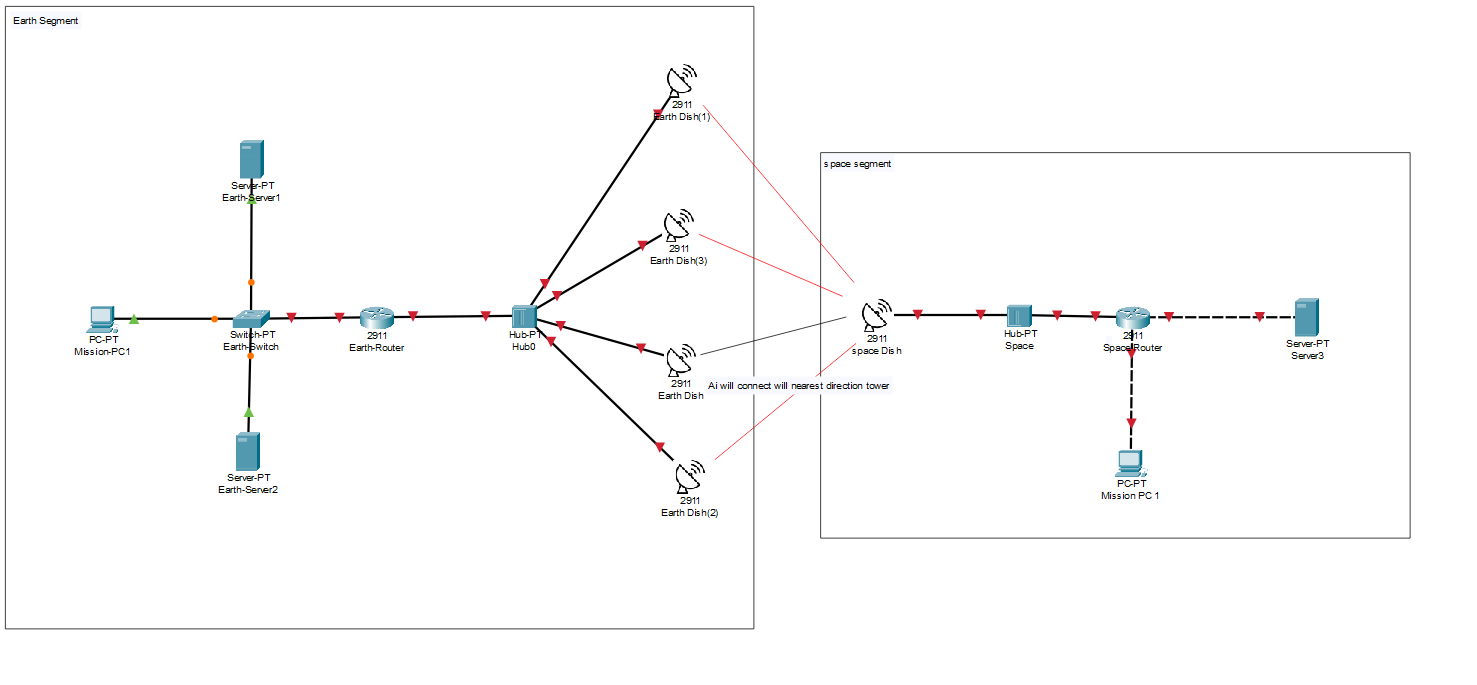 Network simulation showing packet flow between Earth station and Satellite