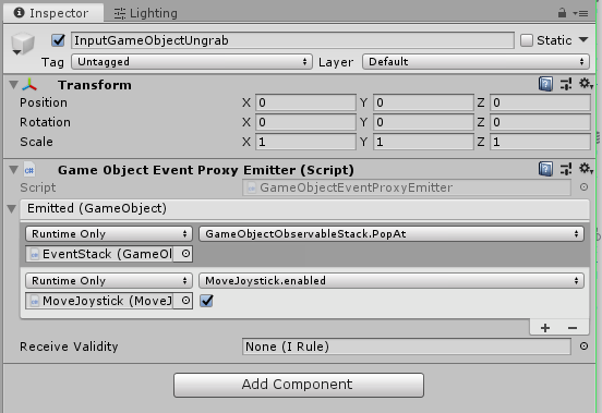 Select InputGameobjectGrab In the Inspector, in the Game Object Event Proxy Emitter, Add another game object to the Emitted script so that it looks like this