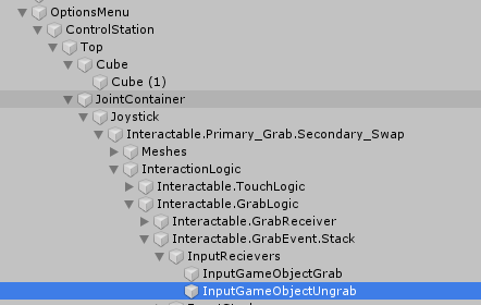 In the radio telescope scene, navigate to OptionsMenu/ControlStation/Top/JointContainer/Joystick/Interactable.Primary_Grab.Secondary_swap/InteractionLogic/Interactable.GrabLogic/Interactable.GrabEvent.Stack/InputRecievers/