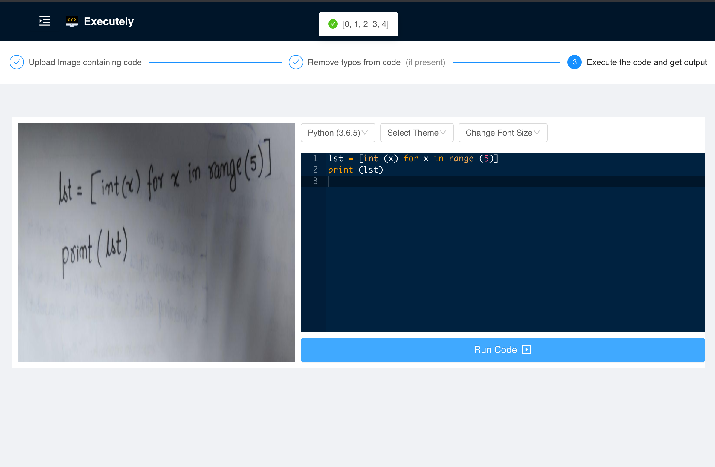 Executely is a webapp which can be used to execute handwritten or printed code in your browser. You just need to upload an image containing the source code and you can check the output of the code within a few seconds.