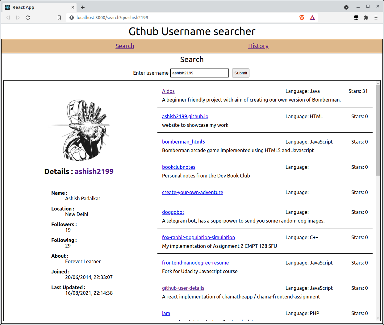 This app fetches data of github users and shows their repository. It also maintains a history of searches performed.