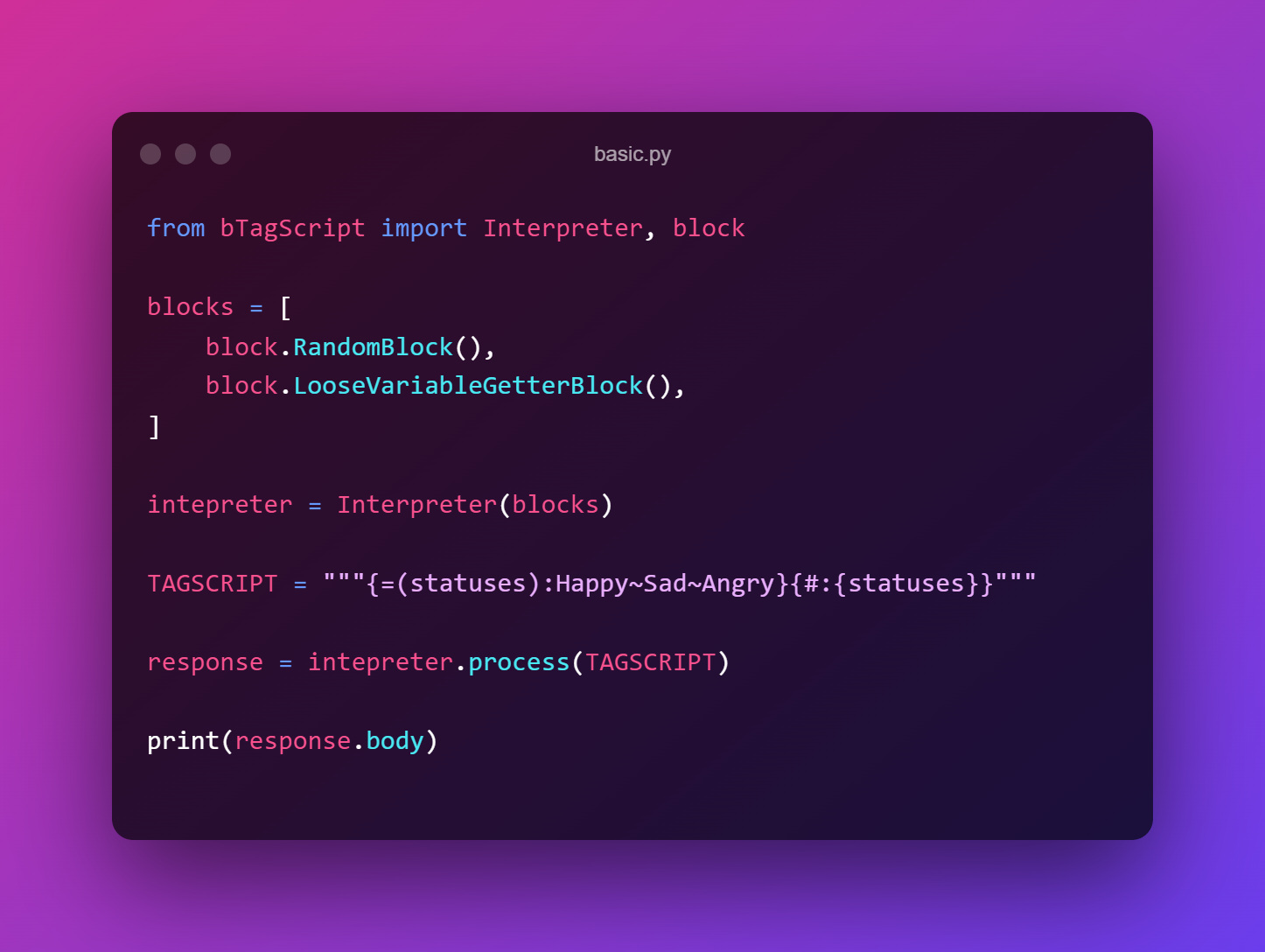TagScript allows you to create low level code, quickly, and easily. This is meant to be used with discord.py 2.0 and is not compatible with other versions.