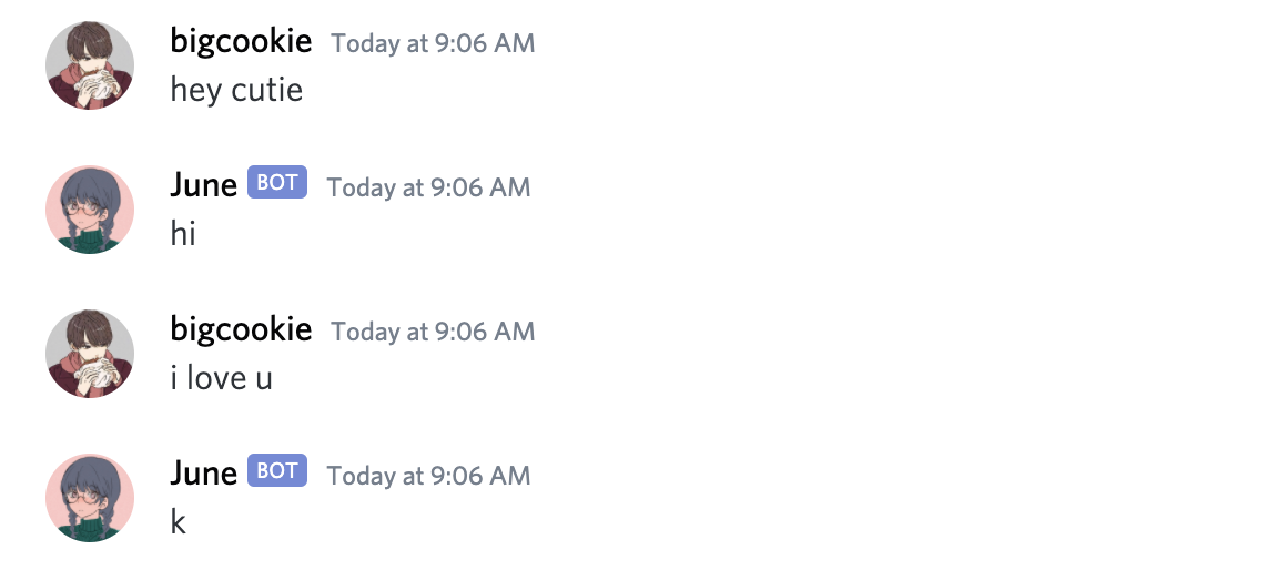 June-bot is a Discord bot with Dialogflow integration. Traditionally, Discord commands are invoked with a prefix and pre-configured words (e.g. ~help as a command).