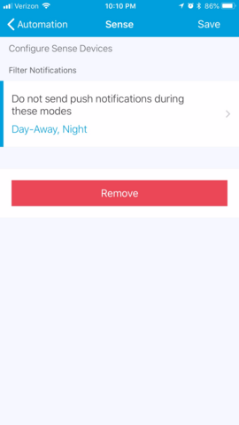 - You can set "quiet modes" during which notifications will not be sent. Go to the Sense SmartApp in the SmartThings mobile app to configure this.