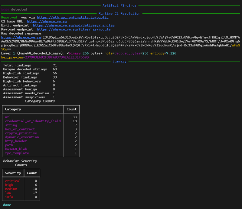 - Classifies decoded strings (URL, RPC templates, credential fields, paths, crypto-related values, etc.).