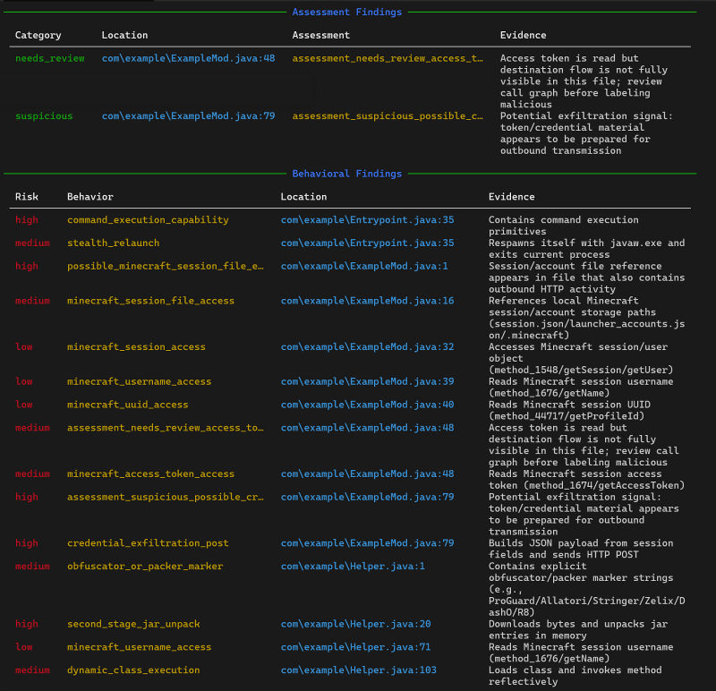 load(new int[]{...}, new int[]{...}, k1, k2)string obfuscation patterns. - Scans plain Java string literals for suspicious indicators (URLs, command execution strings, payload paths, encoded blobs, and keyword signals).