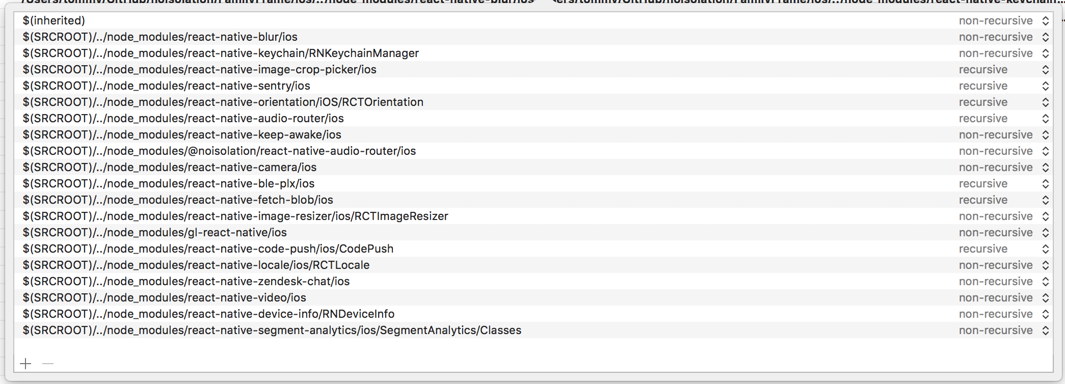 I read that Xcode is limited to the length of the search path it uses during compile, so it's probably because of that? This is how my search paths looks like, and react-native-segment-analytics is a little bit longer than the others:
