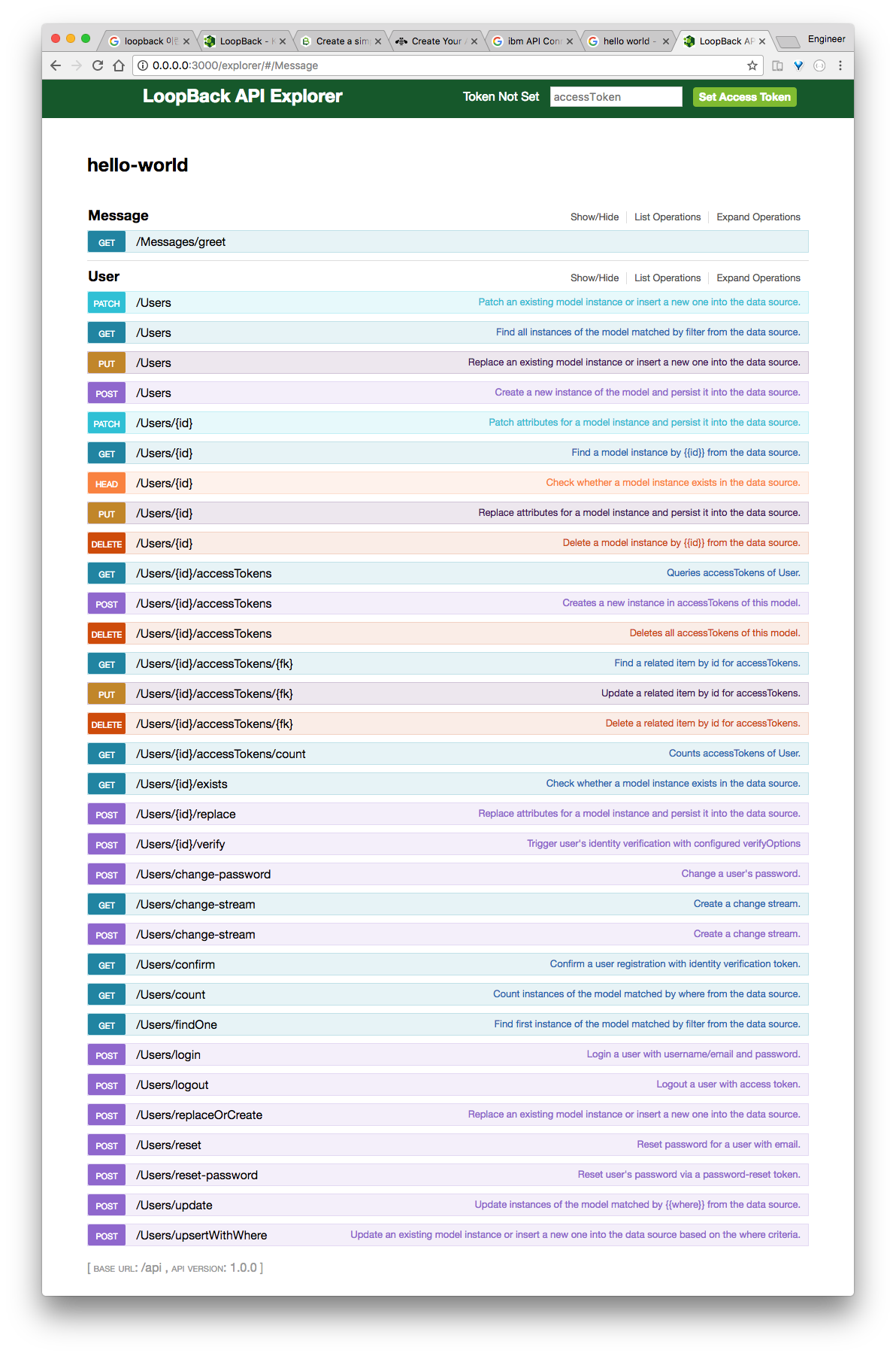 CLI로 생성한 프로젝트 디렉토리로 이동합니다. node .명령어로 프로젝트를 실행 합니다.http://0.0.0.0:3000/explorer로 이동합니다.- API Document