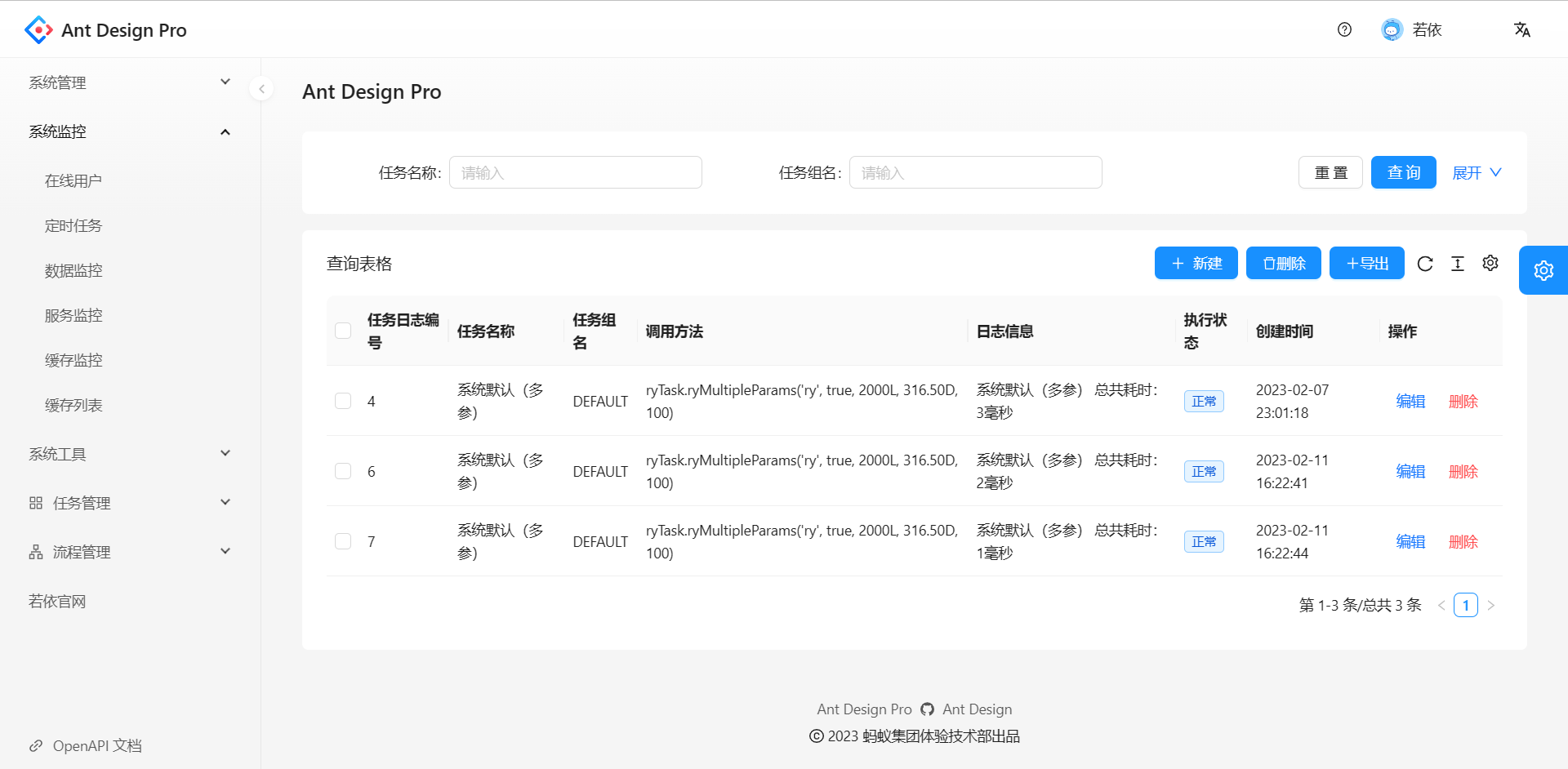 - 定时任务:在线(添加、修改、删除)任务调度包含执行结果日志。