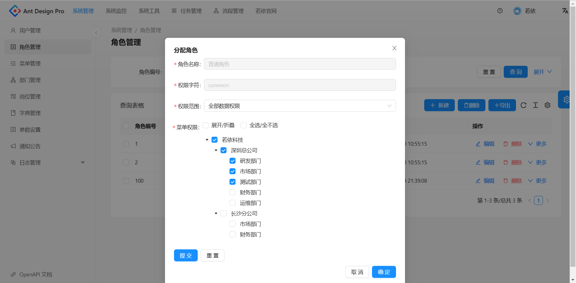 - 角色管理:角色菜单权限分配、设置角色按机构进行数据范围权限划分。