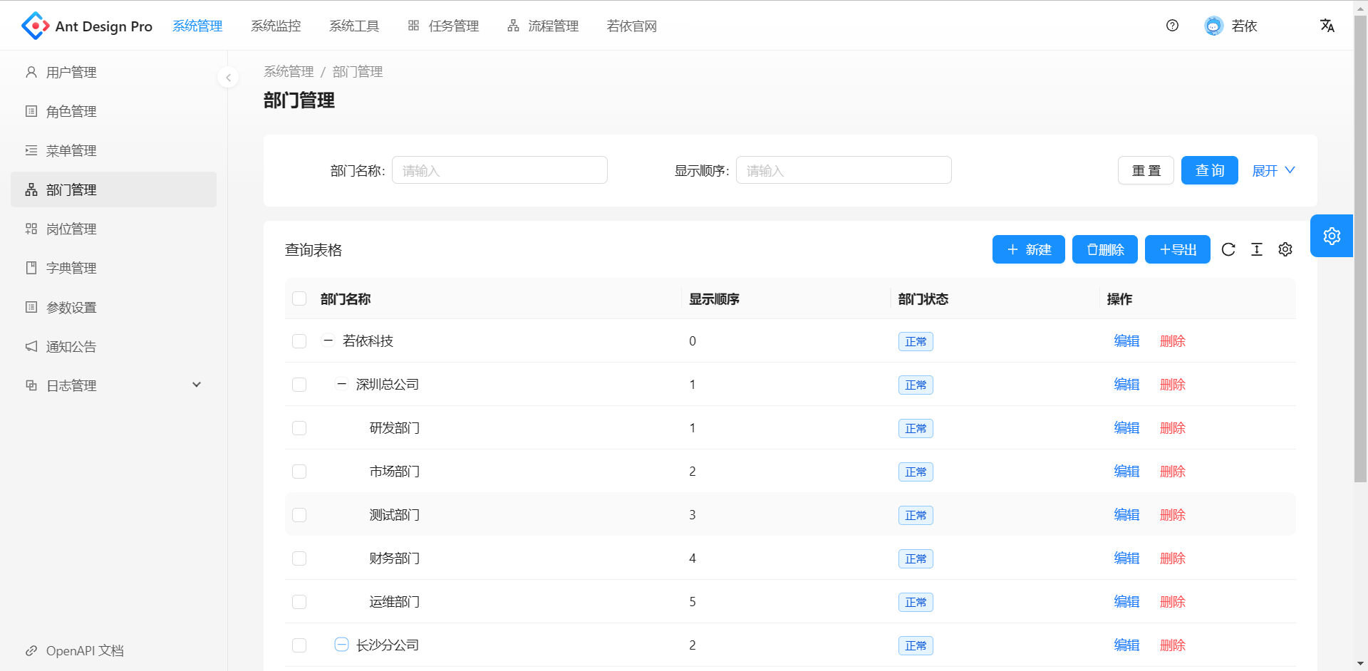 - 部门管理:配置系统组织机构(公司、部门、小组),树结构展现支持数据权限。