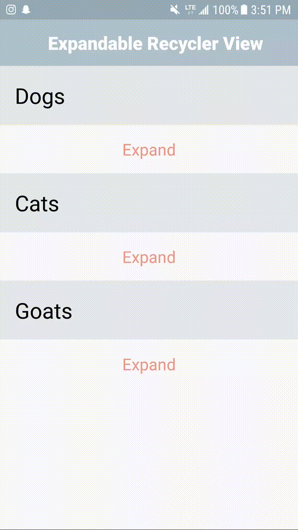 }By design, the ExpandableRecyclerViewAdapter forces your subclass to implement methods of the Expandable Interface. These methods mimic the workflow for a regular RecyclerView and make it simple to handle header, sub header, and content views.