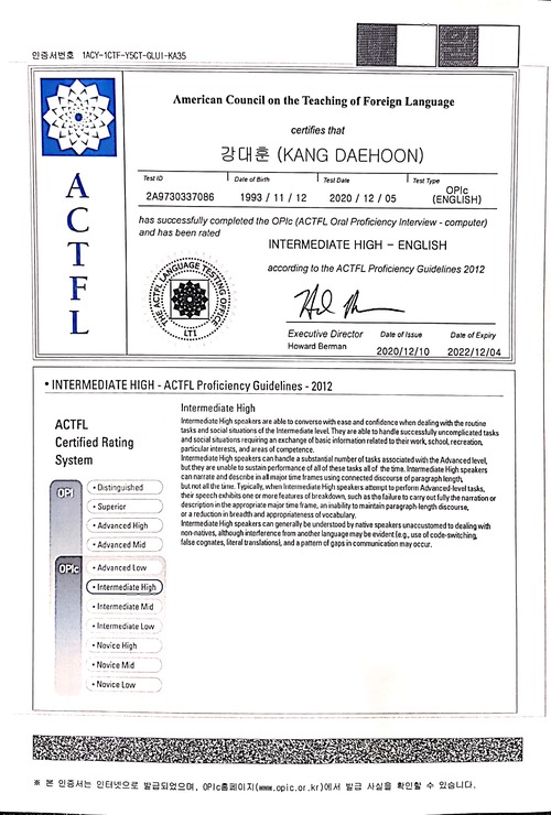 소개 DAEHOON KANG (강대훈), (1993.11.12), 🇰🇷 💻 Backend Developer Languages and Frameworks 기술 블로그 이력 오늘의집페이 백엔드 개발자 (2021.09 ~ ) MUST`IT 백엔드 개발자 (2021.12 ~ 2024.06) 대외활동 2019년 상명대학교 프로그래밍 동아리 Inyro 회장 자격증 TensorFlow Developer Certificate 외국어 OPic IH Projects 가상화폐 자동매매 프로그램 Server: Flask, Client: React 빗썸 API를 통해 백테스팅 후 타겟 가격을 설정한 뒤 자동매매 진행