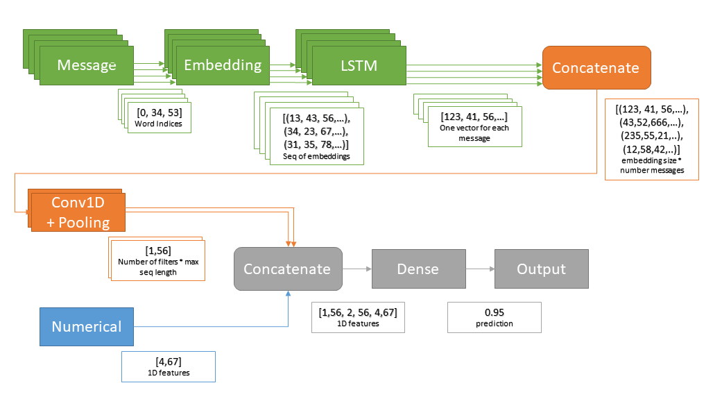 These notebooks have been created during my master thesis about classification of textual dialog data (whatsapp, chats). The goal of this project was to establish a new architecture for artificial neural networks, which is capable of predicting binary classes of dialogs at an state of a conversation.
