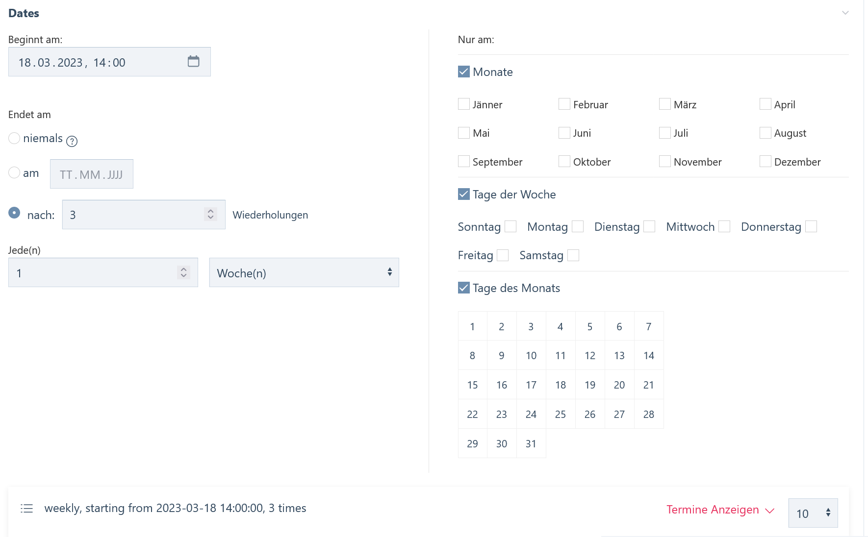 The translations inside InputfieldRecurringDates.js will be defined inside the InputfieldRecurringDates.module. For this case I have created an new method, which holds the translation string called jsTranslations(). This is necessary to create Javascript variables via the PW $config->Js method.