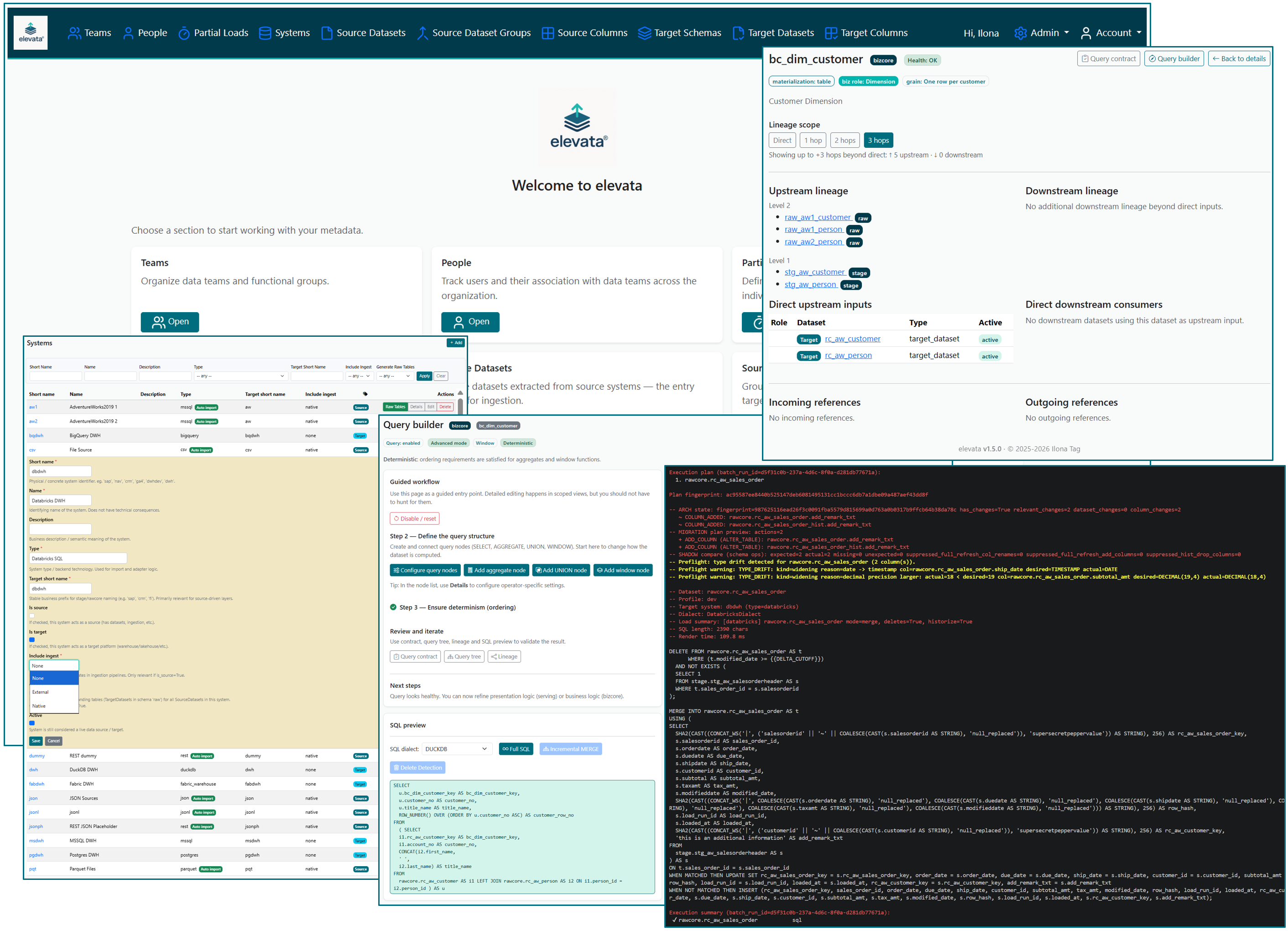 From these definitions, elevata derives deterministic logical plans, renders dialect-owned SQL,