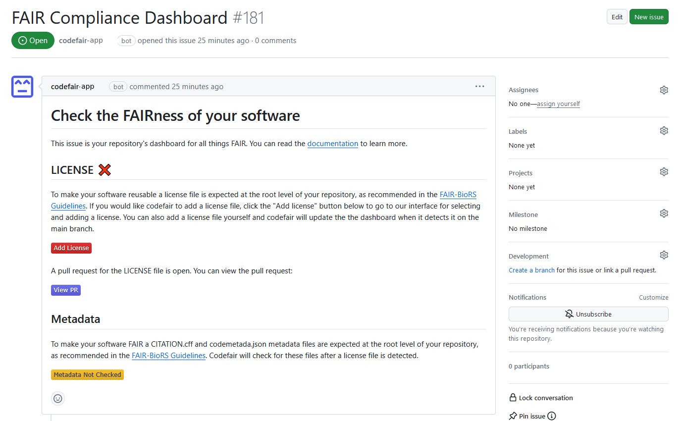- Track FAIR compliance issues through the Codefair issue dashboard and address them through the Codefair website.