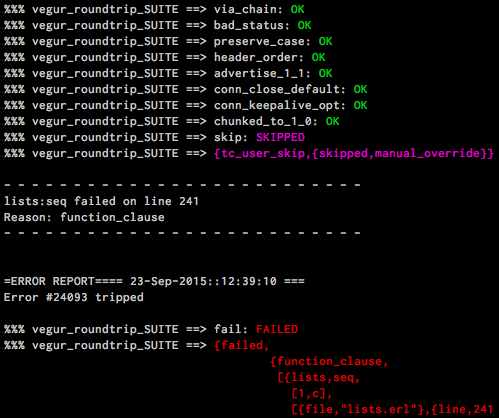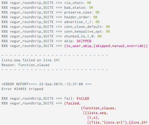 cth_readable_shell, which shows failure stacktraces in the shell and otherwise shows successes properly, in color.cth_readable_compact_shell, which is similar to the previous ones, but only ouputs a period (.) for each successful testcth_readable_failonly, which only outputs error and SASL logs to the shell in case of failures. It also providescthr:pal/1-4functions, working likect:pal/1-4, but being silenceable by that hook. A parse transform exists to automatically convertct:pal/1-3intocthr:pal/1-3. Also automatically handles lager. This hook buffers the IO/logging events, and the buffer size can be limited with themax_eventsconfig option. The default value isinfwhich means that all events are buffered.cth_readable_nosasl, which disables all SASL logging. It however requires to be run beforecth_readable_failonlyto work.