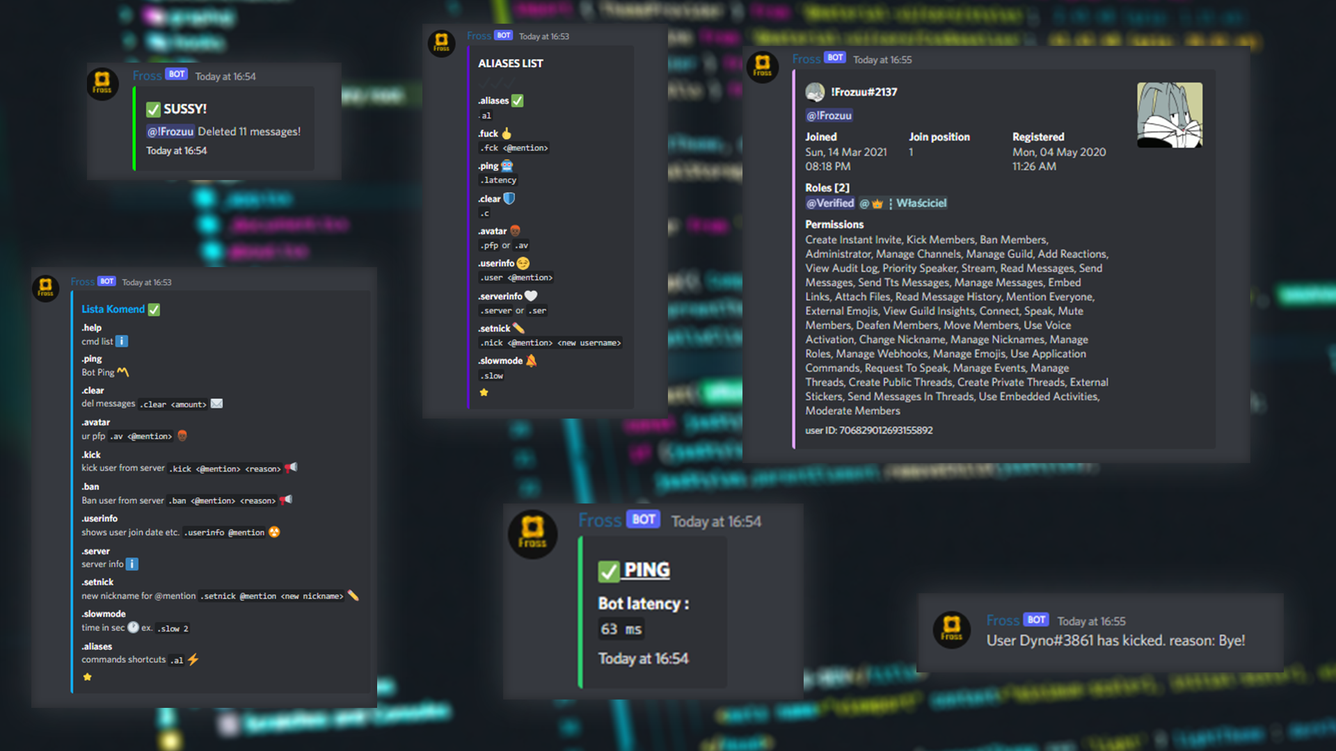 Discord basic bot ๐ Installation python 3.10 discord 2.1.0 BOT_TOKEN in run.py line 15 Features .ping .clear .avatar .kick .ban .userinfo .server .setnick .slowmode .al Authors @Frozuu