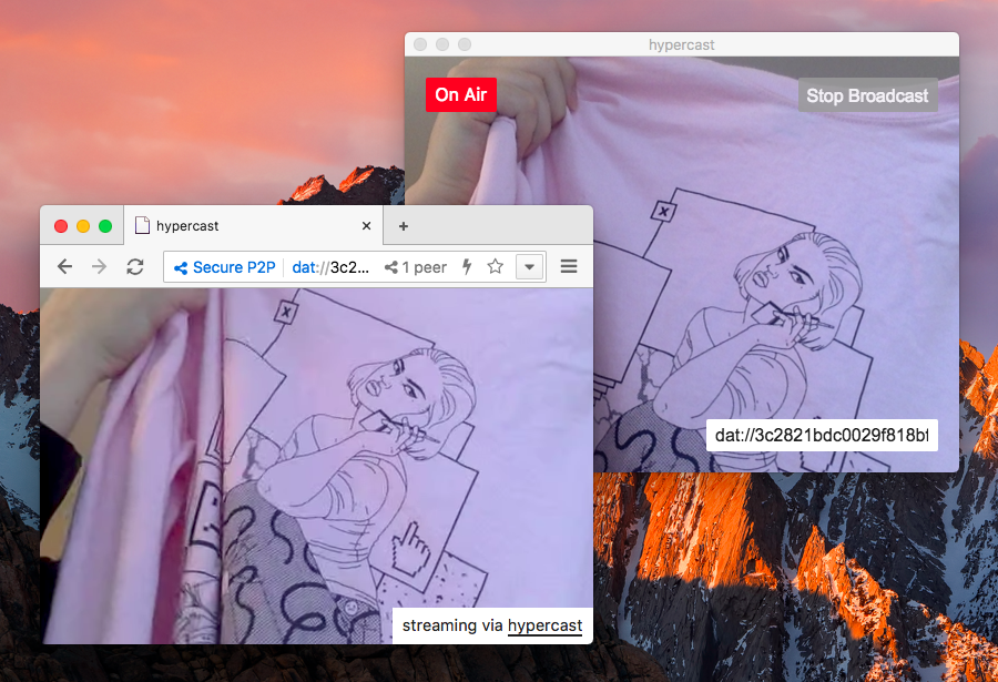 hypercast is a fork of mafintosh's hypervision app. It utilizes modules like hyperdrive and hyperdiscovery from the dat:// ecosystem.