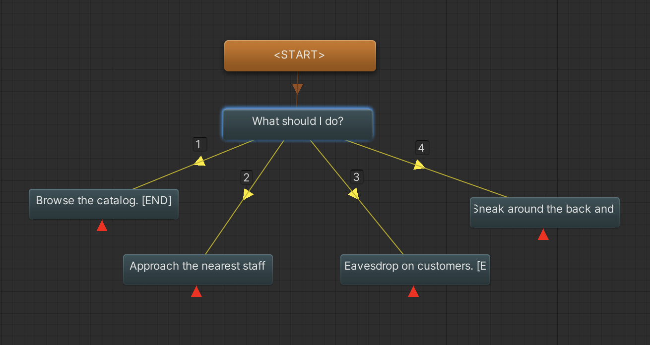 The first node, "What should I do?" is represented in-game as a line of text. All the linked nodes are represented in-game as choices.