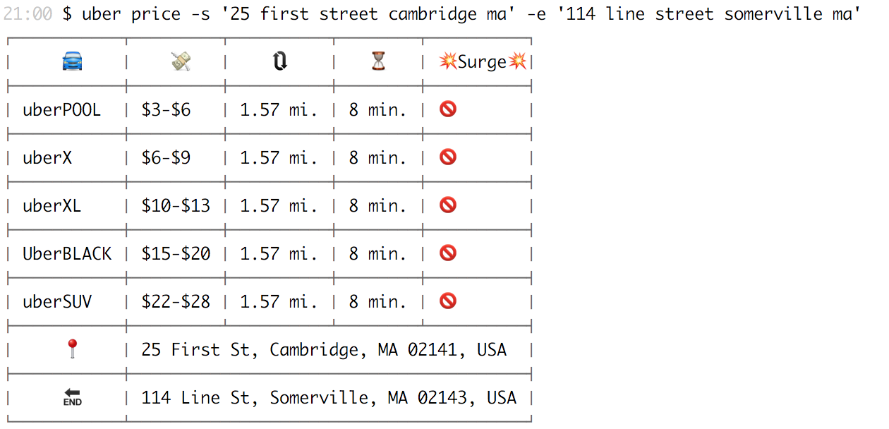 npm install uber-cli -guber time 'pickup address here'uber price -s 'start address' -e 'end address'So the Uber API identifies time and price estimates based on a coordinate and not an address. In order to support those that don't know their exact coordinates at any given time, I'm using the Google Maps Geocoding API to identify coordinates based on an input address.