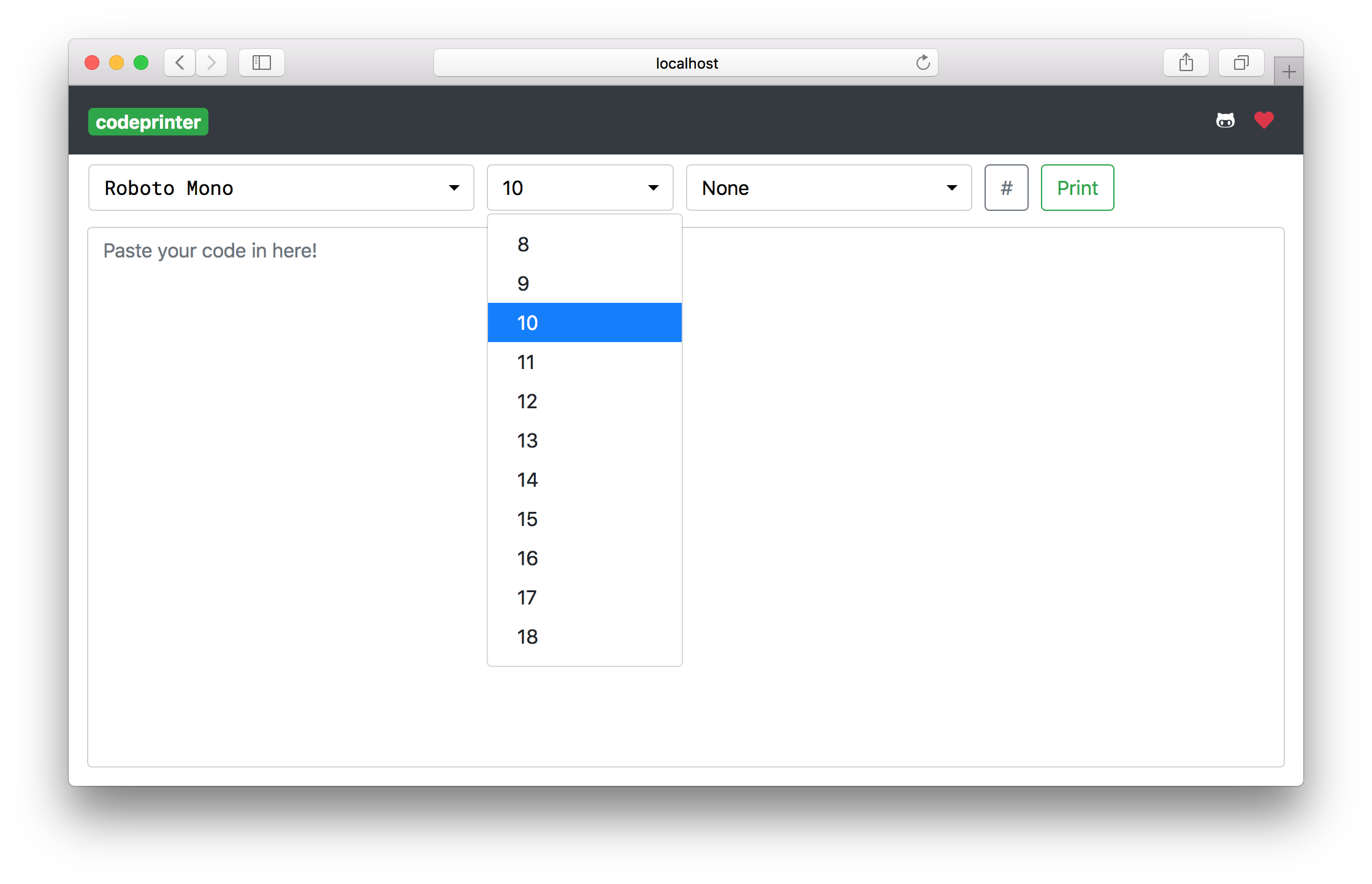 If you're concerned about pasting code into some website, you can use it locally as well. codeprinter is a React project that uses NPM and Node.js, so you'll need both installed in order to do so. Right now, codeprinter supports Node 8.x or higher, but the latest LTS version is always recommended.
